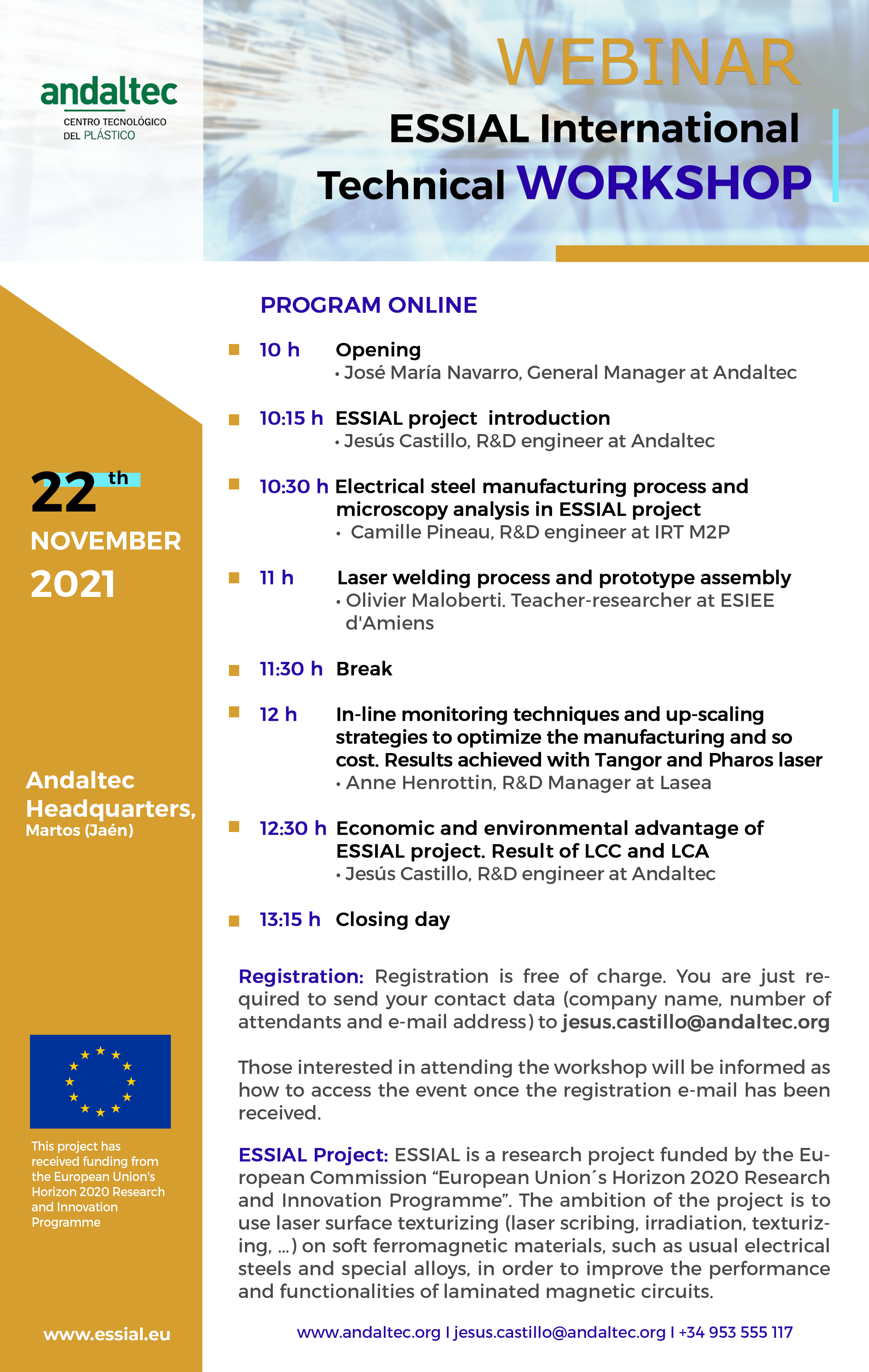 - 10:15: ESSIAL project introduction - Jesús Castillo, R&D engineer at Andaltec