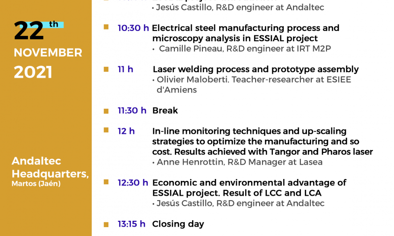 - 12:30 Economic and environmental advantage of ESSIAL project. Result of LCC and LCA - Jesús Castillo, R&D engineer at Andaltec