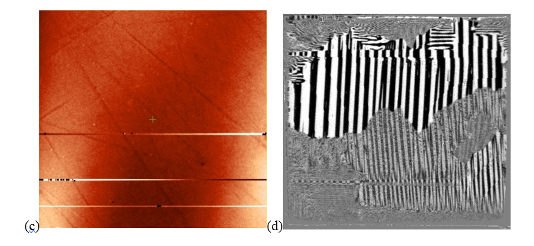 Figure 2: (c) phase magnetic contrast observed by MFM with a hard-magnetic sensor (scan size < 120*120 mm2) (d) magnetic domains observed by MOKE (scan size < 10*10 mm2).