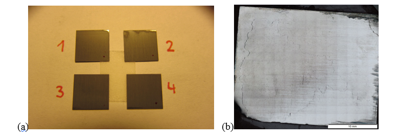 Figure 1: (a) samples of 10*10 mm2 for MOIF and MOKE Imaging (b) Revelation of grain joints in metal.