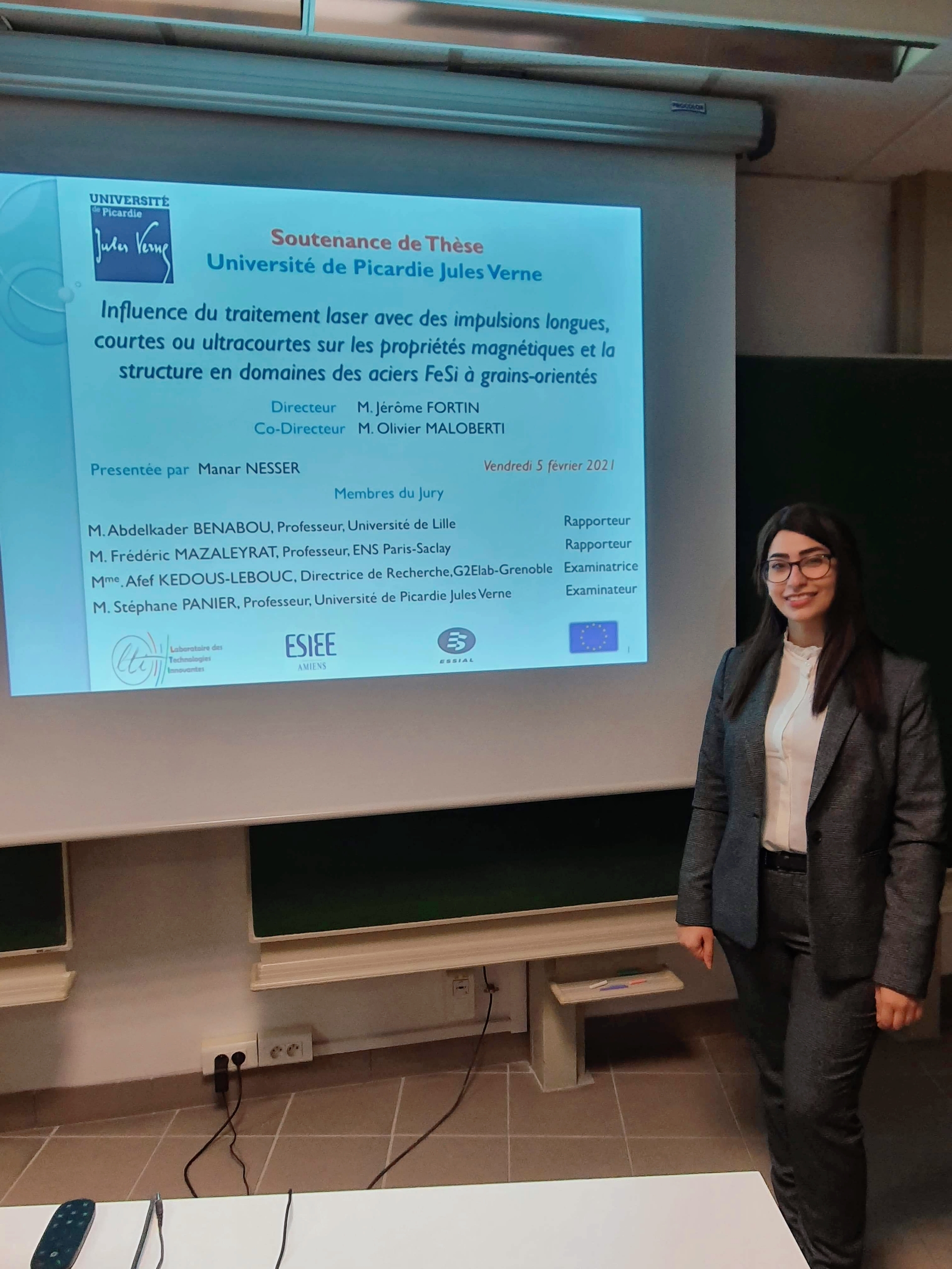 Manar Nesser defended her PhD entitled "Influence of laser treatment with long, short, or ultra-short pulse duration on the magnetic properties and the domain structure of grain-oriented Iron-Silicon steels" on 5 February 2021. This thesis, part of the ESSIAL project, aims to study the impact of ultrashort pulse laser treatment on the magnetic properties of grain-oriented silicon iron electrical steels and to compare this process with the short and long pulse laser. On that account, the impact of each laser is studied using a separated loss model identified by magnetic measurements with an SST "Single Sheet Tester" bench. Optimization of the laser ablation parameters is accomplished ensuring an iron loss reduction at 50 Hz with more than 30% for an induction of 0.5 T, and a percentage of 15% for an induction of above 1.5 T. The ablation process has also shown resistance to a higher temperature than other processes. A correlation between the optical energy parameters, the laser impacts, and the magnetic parameters are presented. Finally, the impact of surface laser treatments on the magnetic domain structure has been analyzed. The results will be used in WP4 (Proof of Concept).