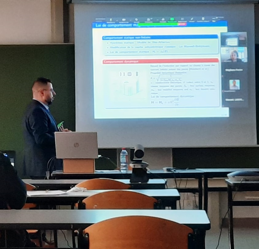 Elias Salloum's thesis, presented on 16 December 2020 at ESIEE Amiens, is entitled "Static and dynamic study of magneto-mechanical properties improved by surface laser texturization in electrical steels". It consists in studying the effect of the laser treatment on the magneto-mechanical behavior of electrical steels in order to define the laser configurations that reduce the most the noise and vibration of magnetic origins. The study includes modeling and experimentation analysis that were performed in the Work Package 3 (Physical studies) of ESSIAL and has shown a vibration reduction up to 50%. The work was performed in collaboration with different partners of the project, especially when selecting the optimal laser configurations and performing the treatment, and has contributed in four impacted scientific publications. For the future, Elias will be working on the WP5 (Prototypes), using the identification study performed in WP3, in order to apply the obtained results in electrical machines.