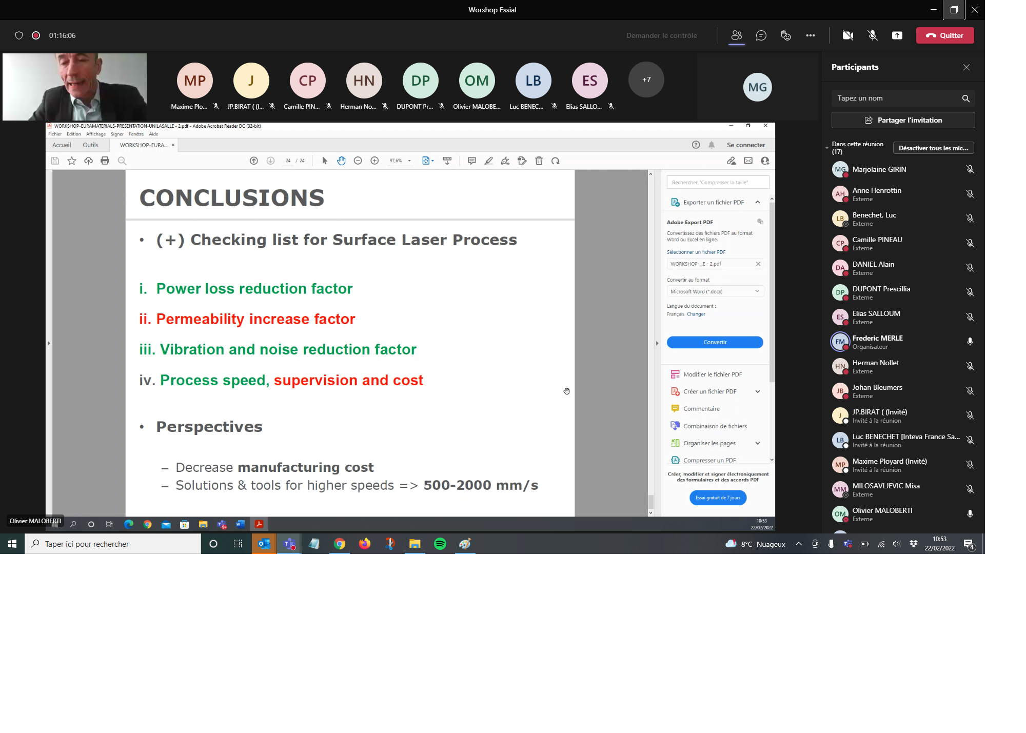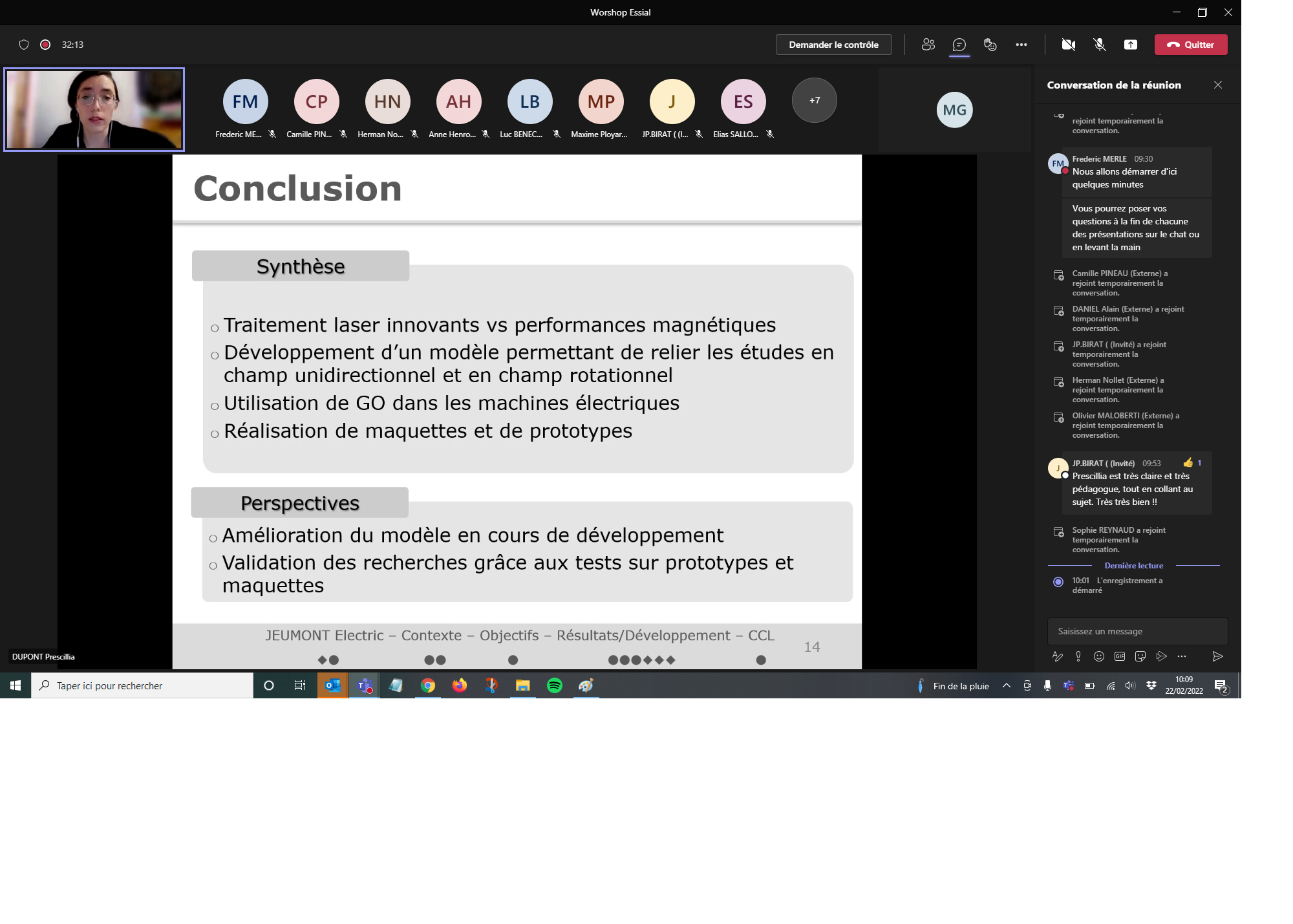 - Prescillia Dupont et Maxime Ployard (Jeumont and Unilasalle) presented the impact of surface laser processes by ultra-short pulses on the magnetic properties of electrical steels for electrical machines.