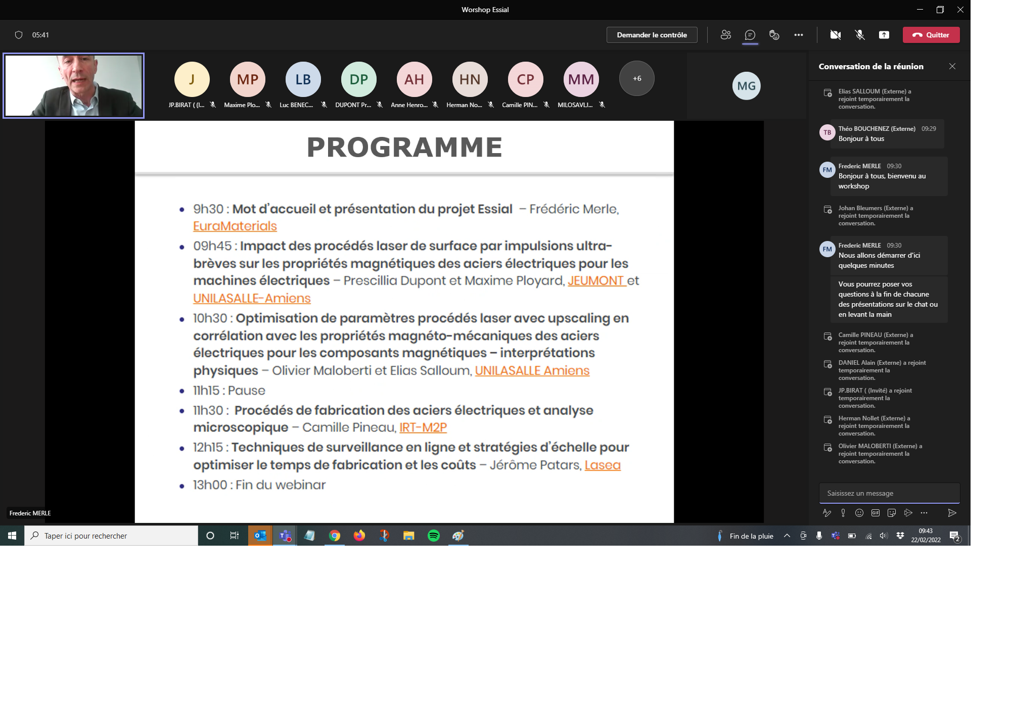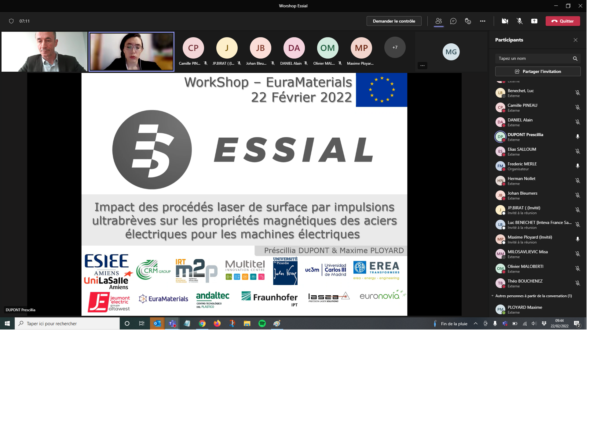 On Tuesday 22 February Euramatarials organised a workshop related to the laser technologies for structuring, insulating and joining electrical steel. Initially planned on-site, the workshop has to take place online due to the health situation. The workshop brought together around 15 participants, includint stakeholders. It was the opportunity to engage with them and to discuss the functionalization of soft magnetic steels by laser structuring.